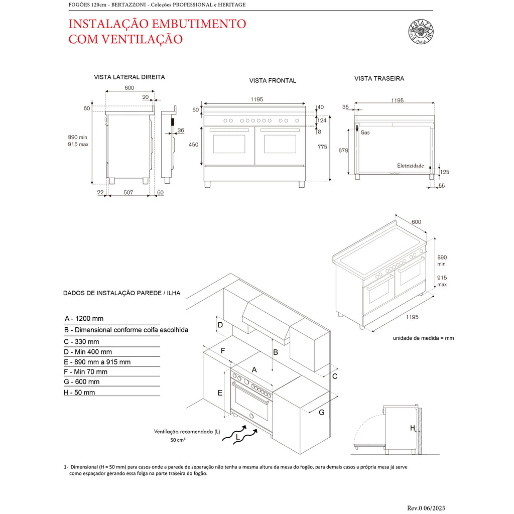 Fogão a Gás com Forno Elétrico Bertazzoni - Linha Heritage - Modelo 6 Queimadores + Grill de Mesa / 120cm